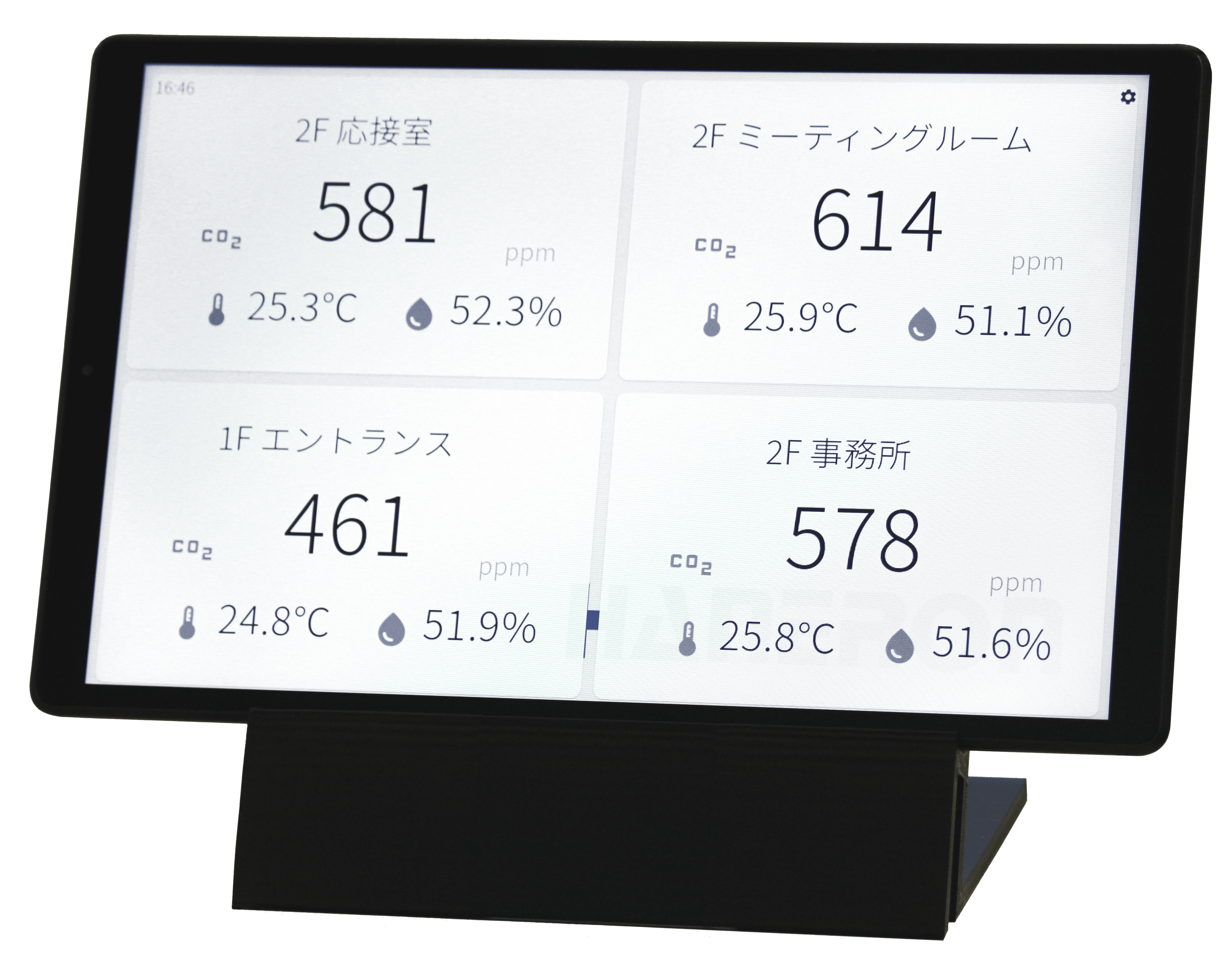 センサーからBlueToothで送信されたデータ(CO2、温度、湿度)をタブレットに表示させるシステムです。